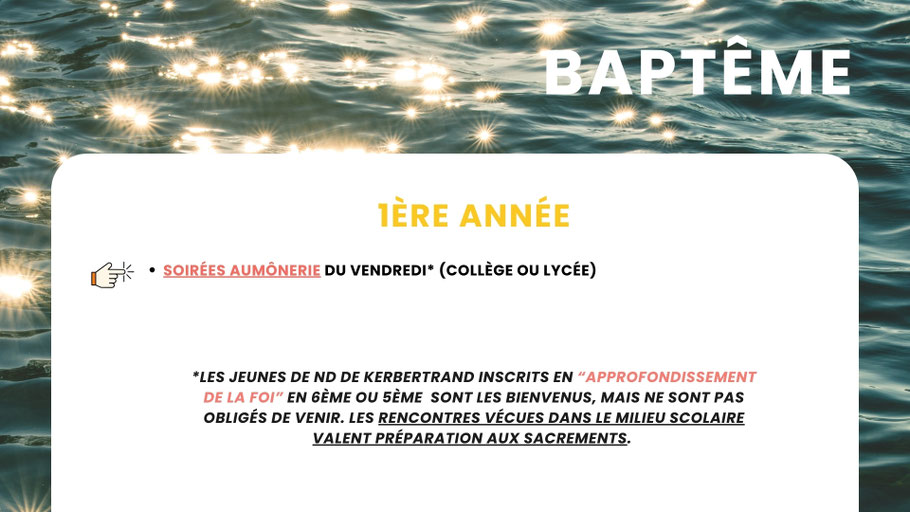 Si tu es décidé(e) à demander le baptême, alors il faut continuer de venir aux soirées aumônerie (au moins la 1ère partie) qui ont lieu 2 vendredis par mois et aux temps forts du parcours vers le baptême (Entrée en catéchuménat, Appel décisif, Scrutin).